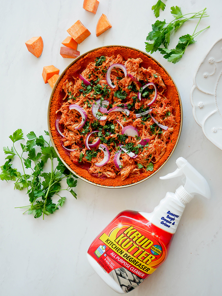 Whether you’re paleo, grain-free, gluten-free, or doing the Whole30 program, this baked Sweet Potato Crust BBQ Chicken Pizza Messipe is for you! The recipe is worth the mess, especially when you use Krud Kutter for quick and easy clean up.