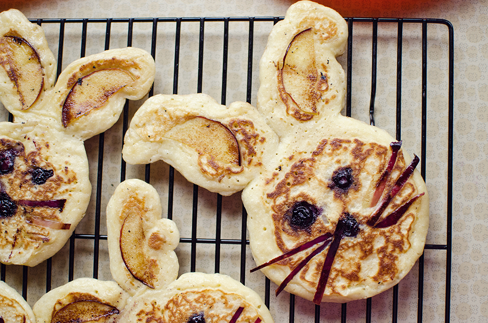 - Heat a lightly oiled griddle or frying pan over medium high heat. Pour or scoop the batter onto the griddle in bunny head and ears shapes, using approximately 1/4 cup for each pancake. When pancakes start to bubble, flip them over and brown on the other side, approximately 1-2 minutes. Serve warm.