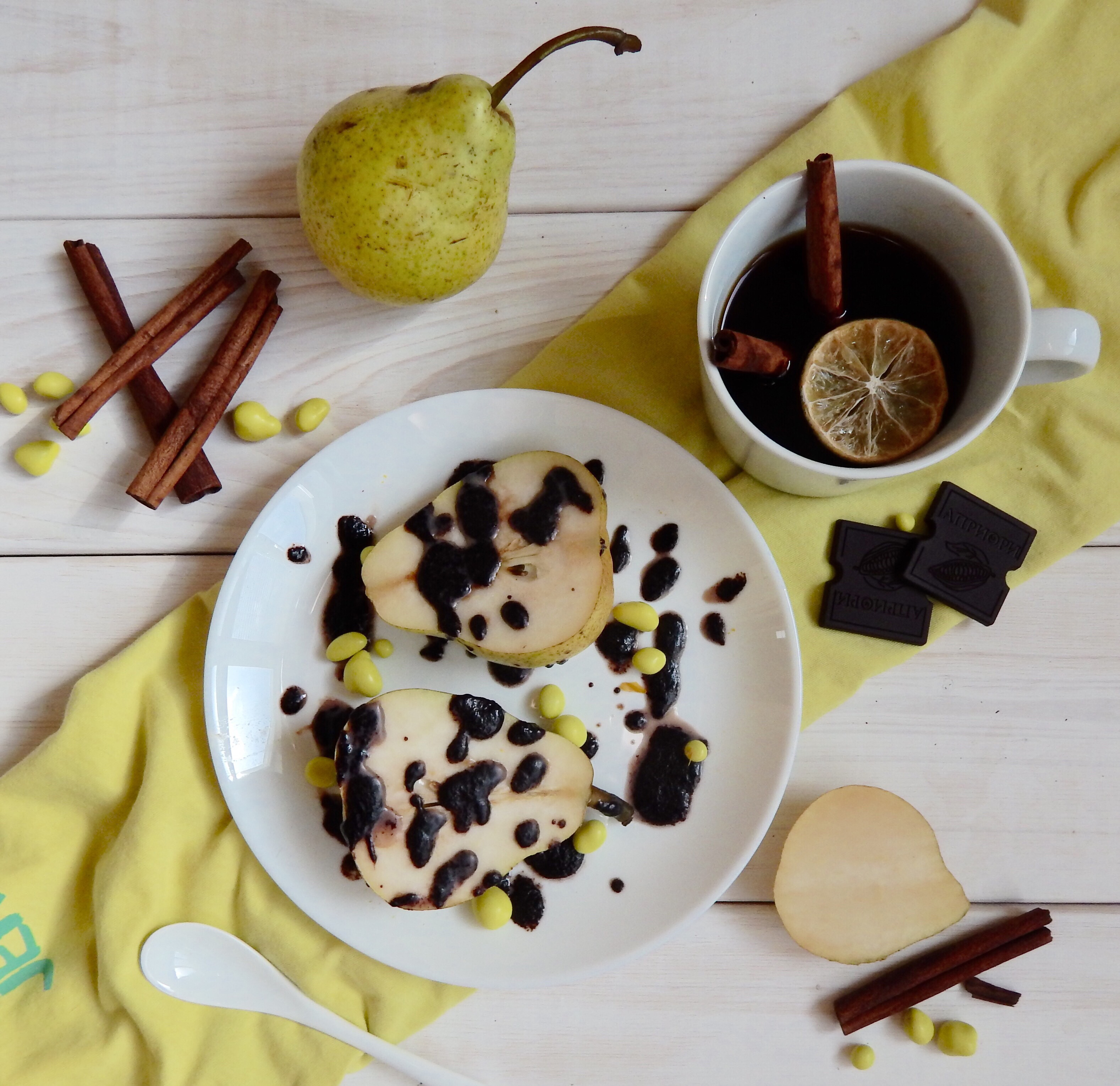- Place warm pears on a serving platter and drizzle with warm chocolate sauce. Serve immediately.